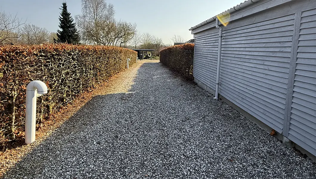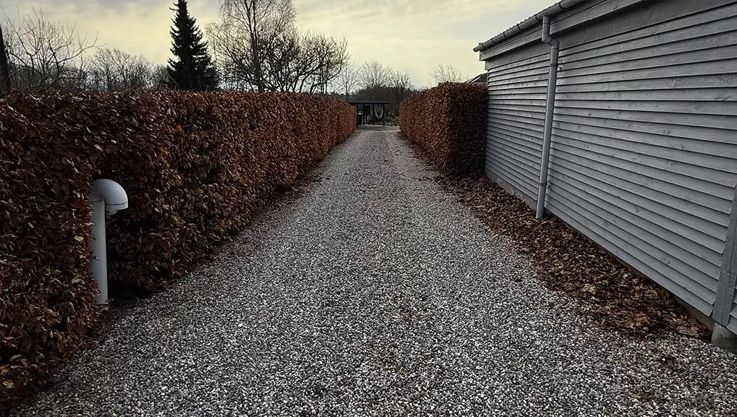 En tæt og præcis hækklipning har forvandlet denne indkørsel til en snorlige og indbydende ankomst. Ved at fjerne vildskud og oprense arealet for visne blade har vi genskabt de skarpe, lodrette linjer, der får de lyse granitskærver til at stå knivskarpt mod hækken. Resultatet er et professionelt og gennemført velholdt look, der løfter hele ejendommens førstehåndsindtryk.