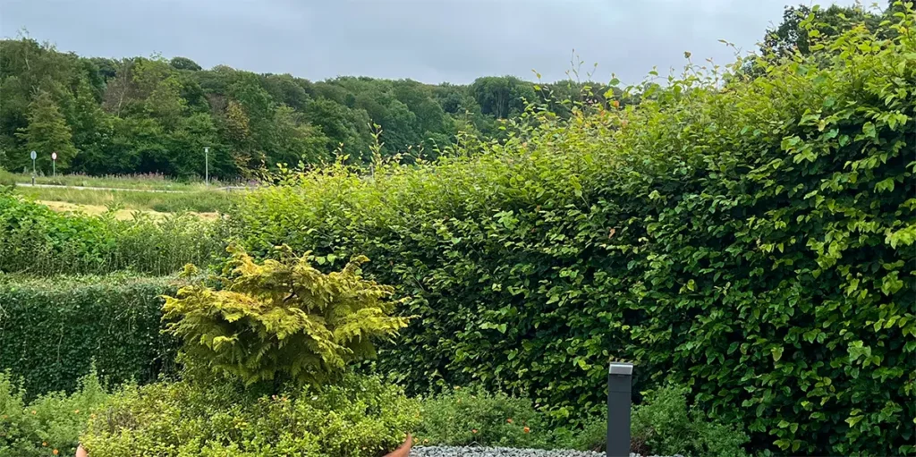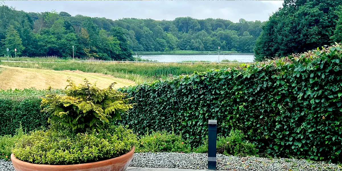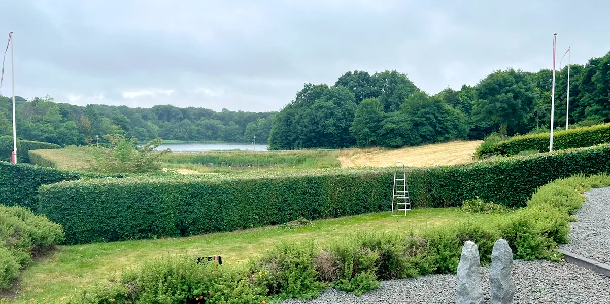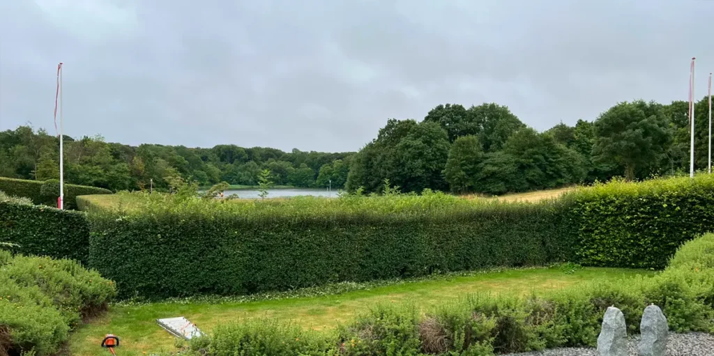 En markant topbeskæring af denne bøgehæk har forvandlet haven fra at være indelukket til at have fuldt udsyn over det smukke sølandskab. Ved at sænke højden har vi fjernet den massive visuelle barriere og skabt en naturlig sammenhæng mellem terrassen og de grønne omgivelser. Resultatet giver masser af nyt lys og luft til haven, samtidig med at hækken stadig fungerer som en pæn og defineret afgrænsning af grunden.