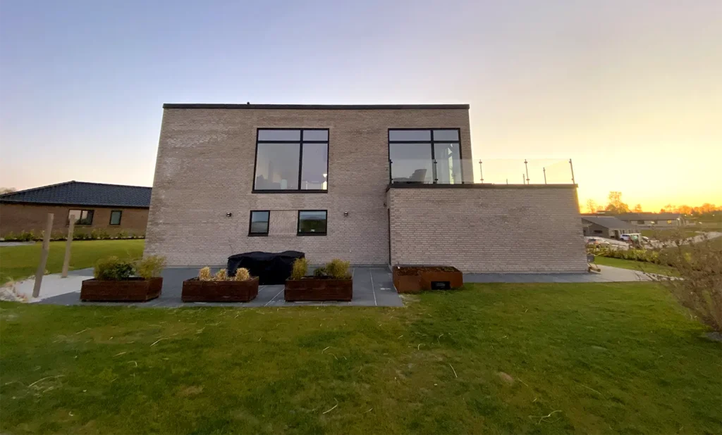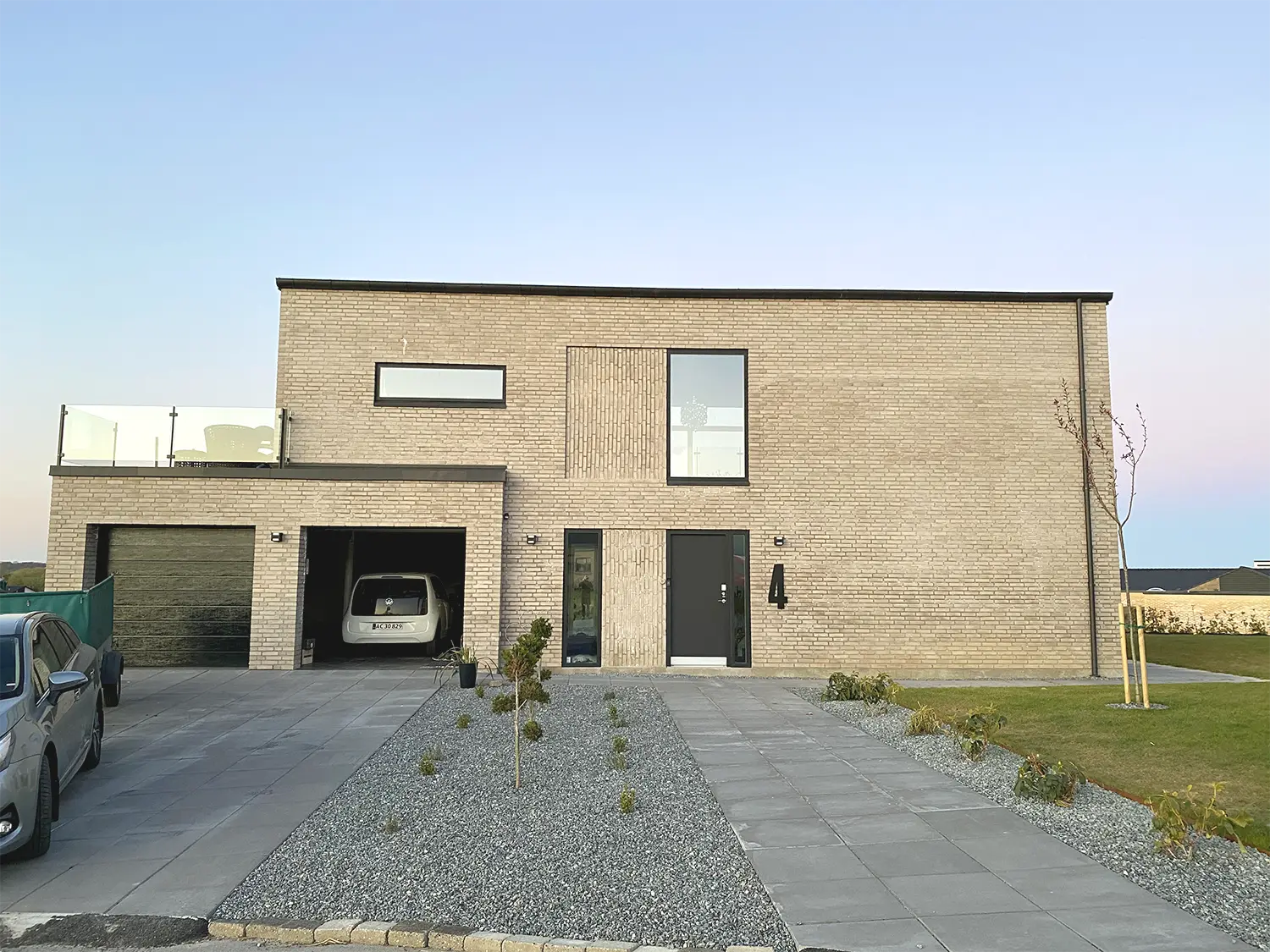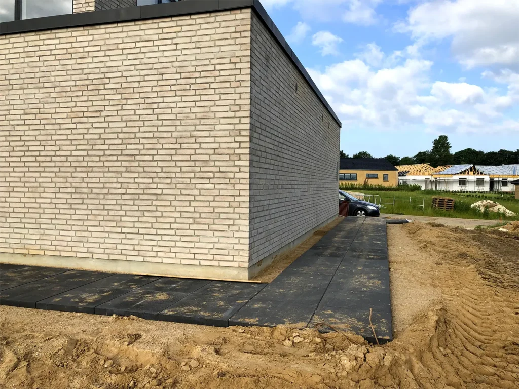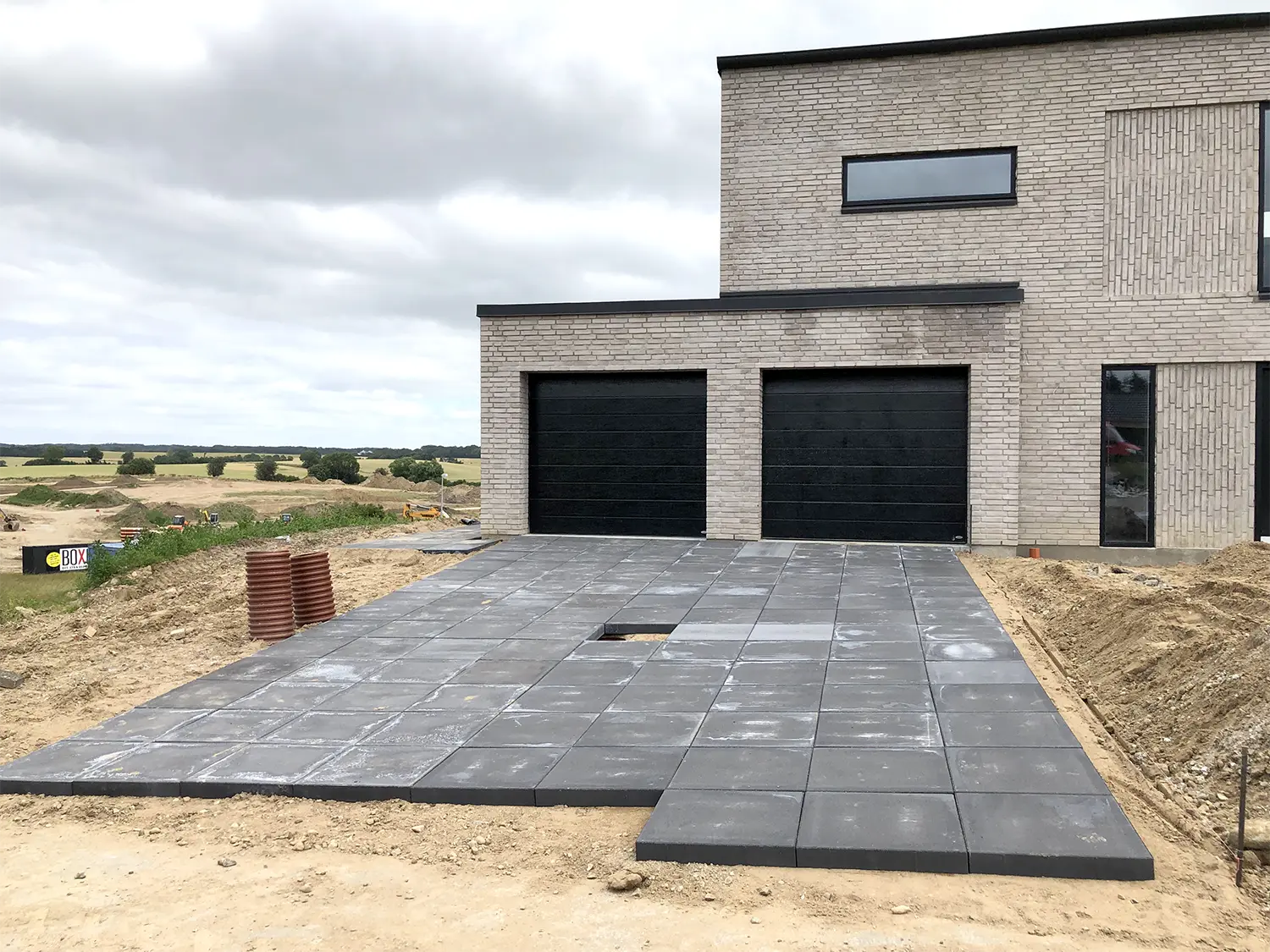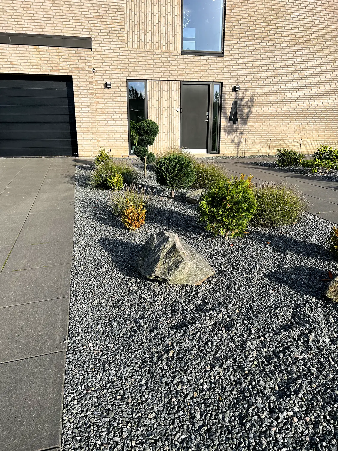 Billederne illustrerer sorte, slidstærke fliser til indkørsel og garage med dobbelt port, flisebelagte terrasser med integreret belysning og dræn, samt flot overgang til grusarealer, sten og nyplantede buske/træer. Vi håndterer alt fra grundforberedelse, dræning, underlag og præcis lægning af fliser til æstetisk finish med gruskanter og beplantning. Resultatet er funktionelle, vedligeholdelsesvenlige og stilrene udendørsarealer – perfekt til parcelhuse og nybyg i Horsens, Skanderborg, Silkeborg, Ry, Gedved, Mårslet og omegn. Lad os anlægge din belægning i dag!